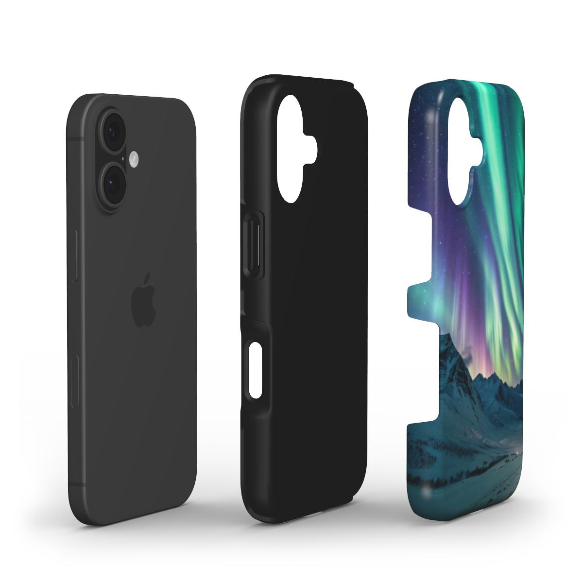 Capture the mesmerizing beauty of the aurora borealis with this tough phone case. The design features vibrant streaks of green, purple, and pink light dancing across a star-speckled night sky, illuminating a rugged mountain range below. The overall atmosphere is tranquil yet awe-inspiring, showcasing the raw and captivating power of nature. Perfect for adults who appreciate nature and want durable protection for their phone. Ideal for gifting during holidays like Christmas, birthdays, or special occasions.