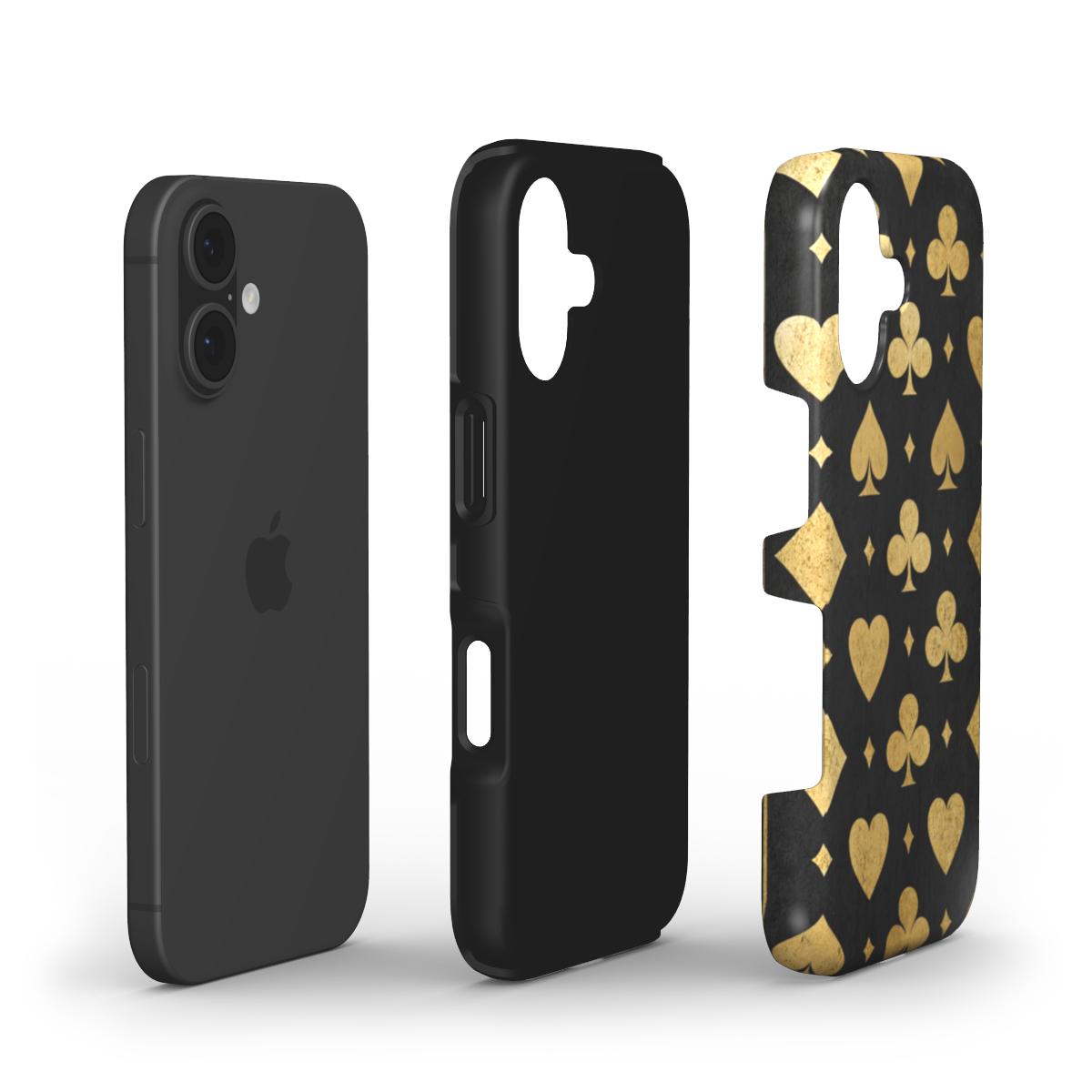 A tough phone case with a design inspired by playing cards suits Spade, Diamond, Heart, and Club. This case offers excellent resistance to outdoor weathering, longterm optical quality, and good shock absorption to protect against drops and tears. Suitable for adults who enjoy unique designs and need durable protection for their phone. Perfect for gifting on birthdays, holidays, or special occasions.