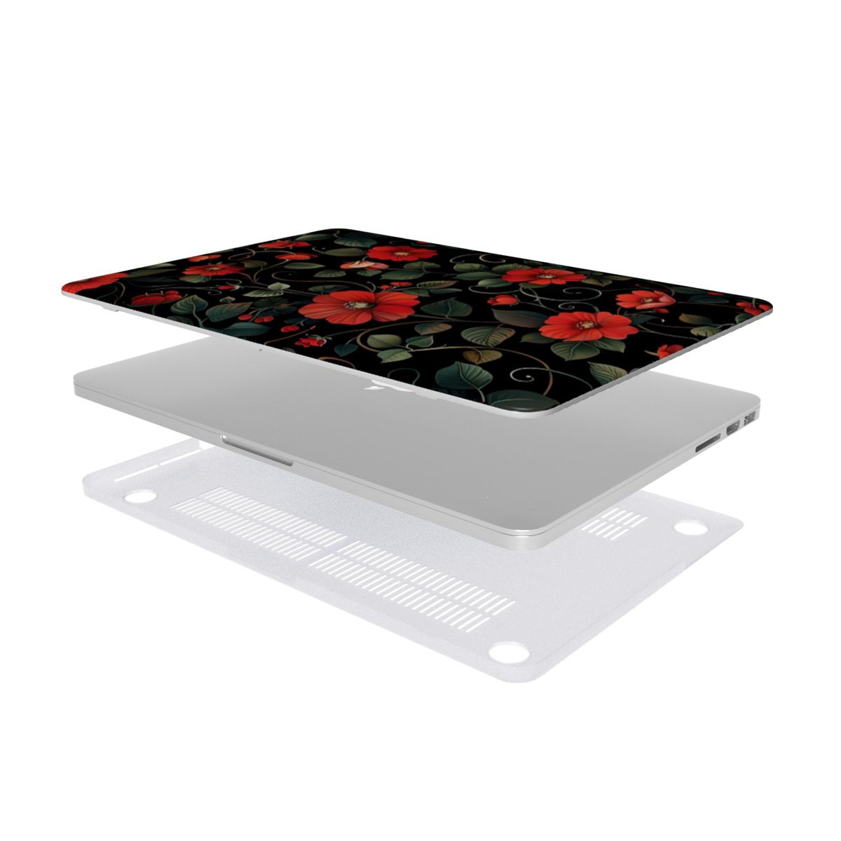 Make a statement with this dark floral botanical MacBook case, featuring striking red blooms and leafy vines on a rich, black backdrop. The vibrant botanical pattern offers a sophisticated, high-contrast aesthetic.